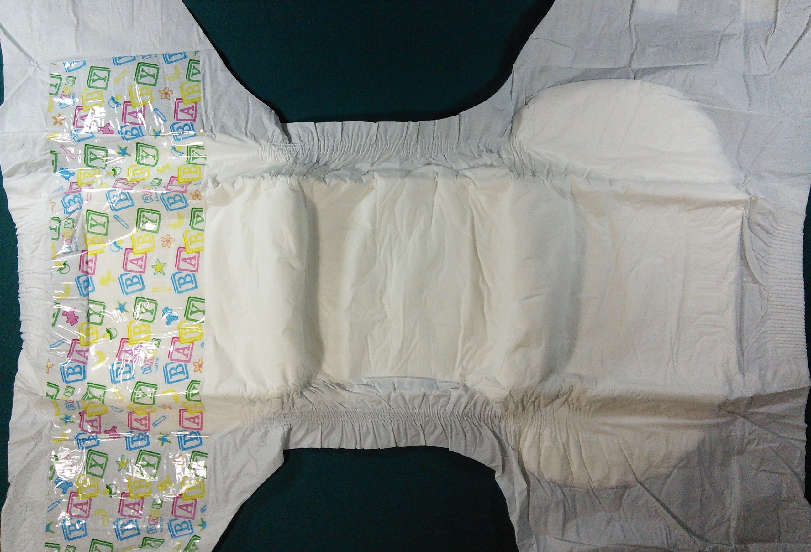 White plastic brief with “A”, “B”, “C”, “D” blocks in green, blue, yellow, and pink; clear plastic landing zone; green and blue pinstripes on the wings and leg gathers.