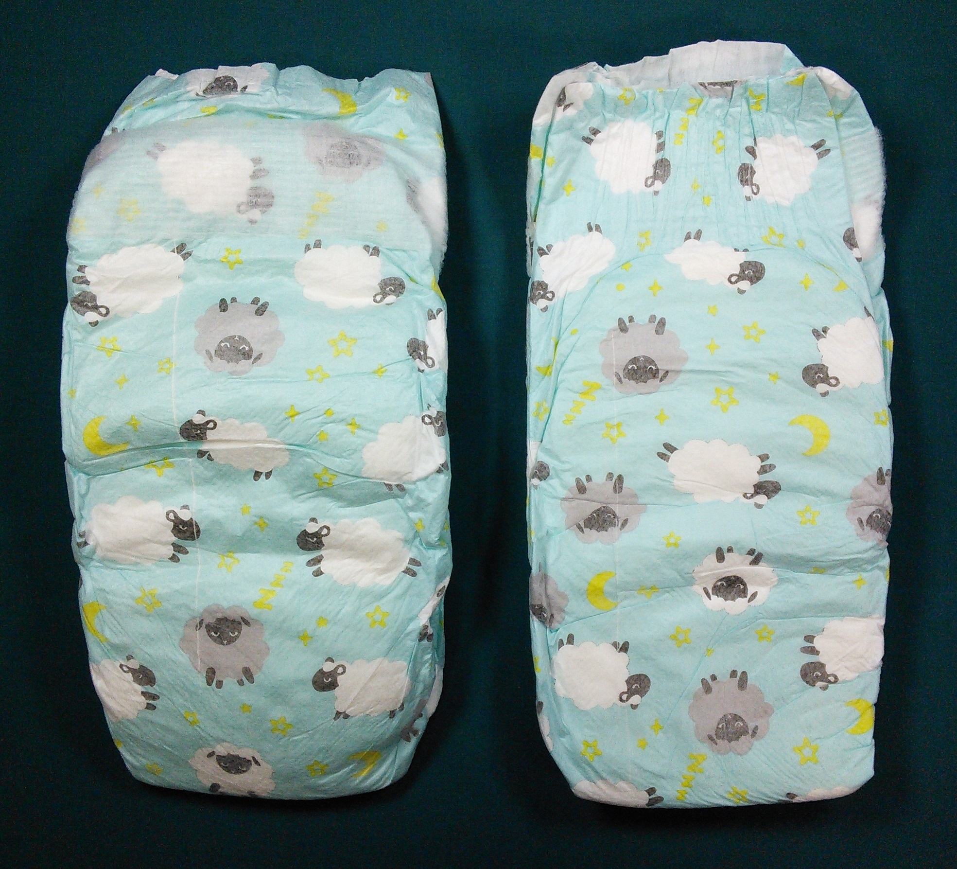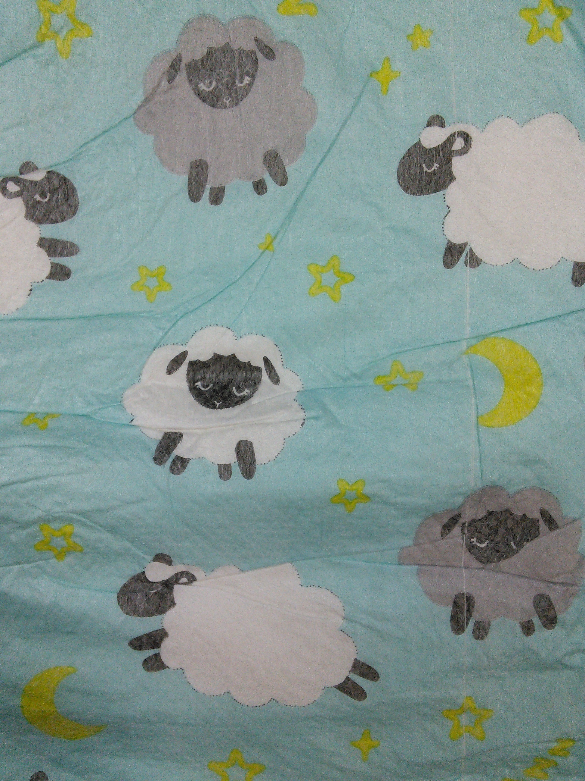 Light blue-green baby diaper with gray and white sheep and yellow crescent moons, stars, and “zzz”.