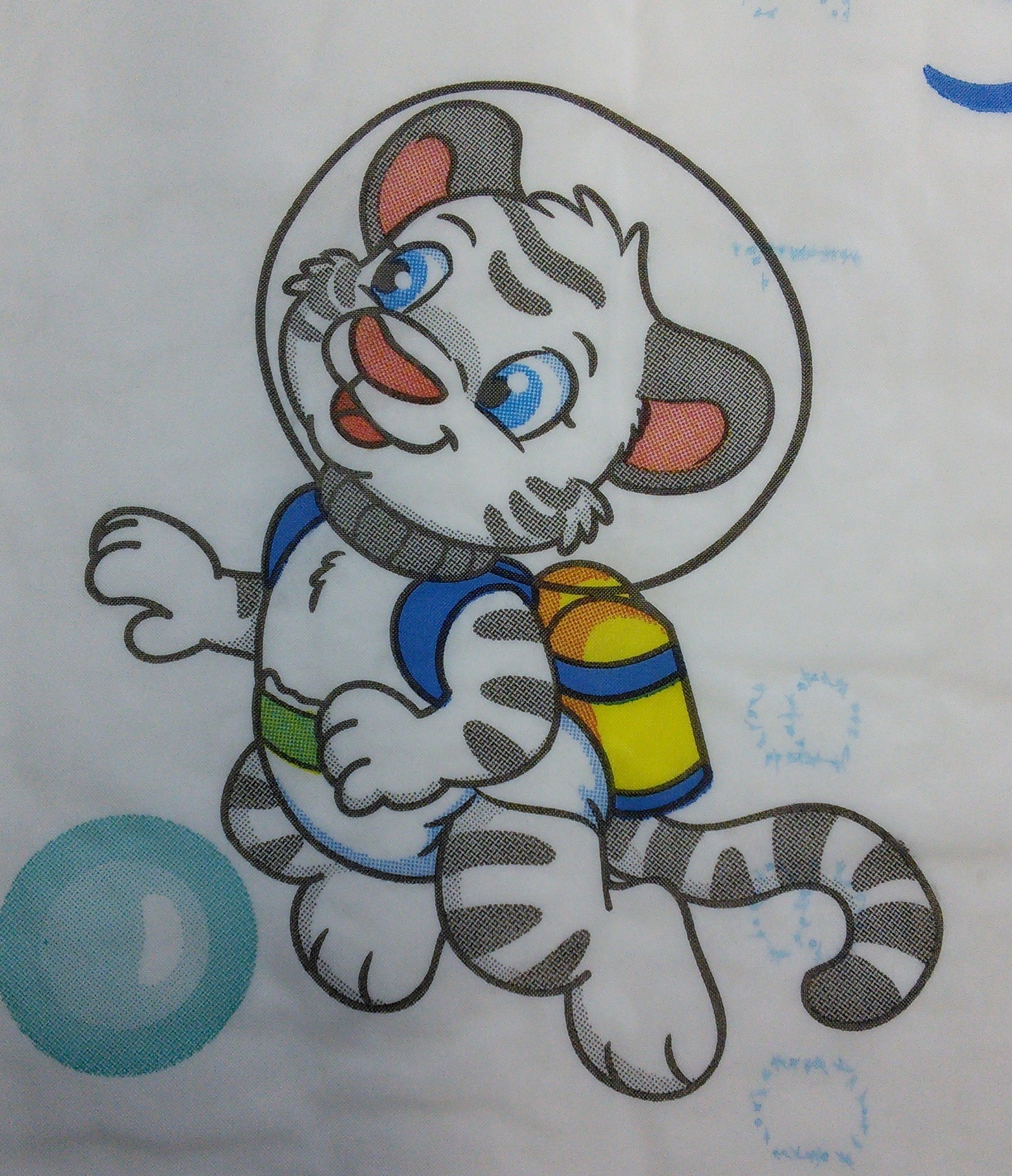 White plastic brief with white tigers and foxes in scuba gear, monkeys with swim goggles, and bears with floaties and snorkels. Fish, jellyfish, submarines, dolphins, and bubbles. Cyan wave pattern running through the gathers with “Crinklz” and yellow and blue wavy stripes. Starfish and bubbles on the wings.