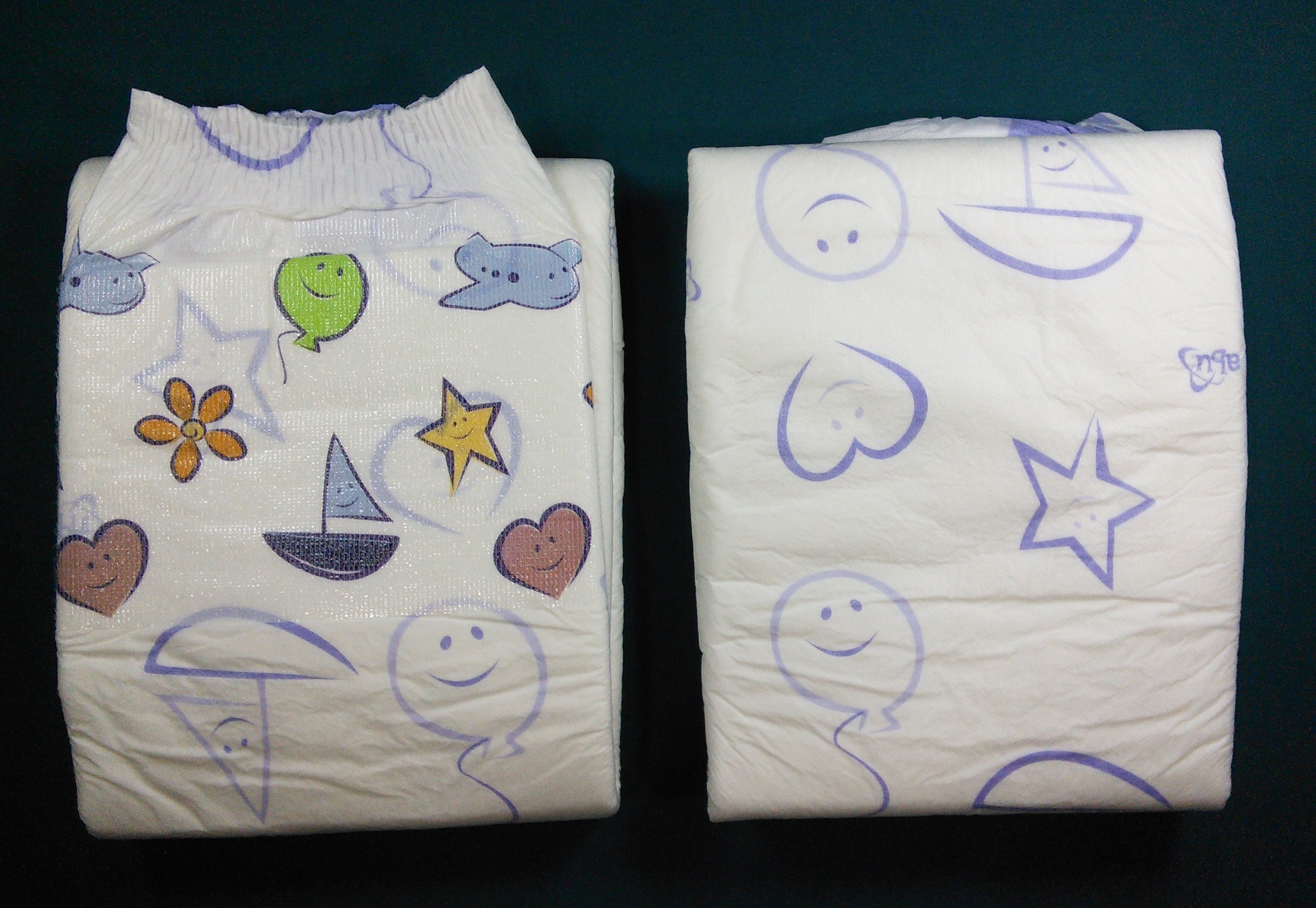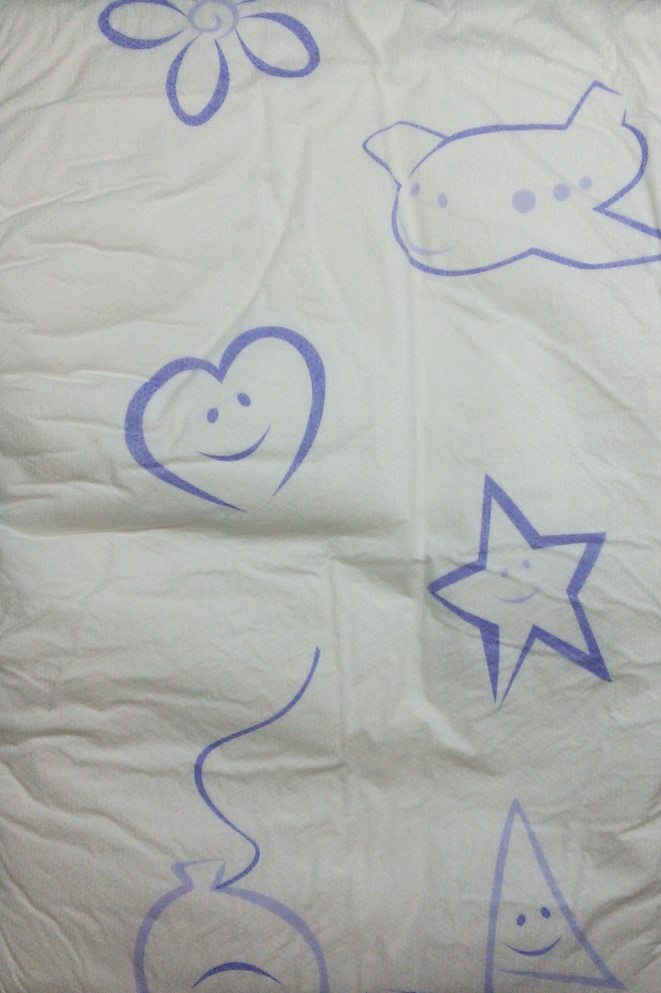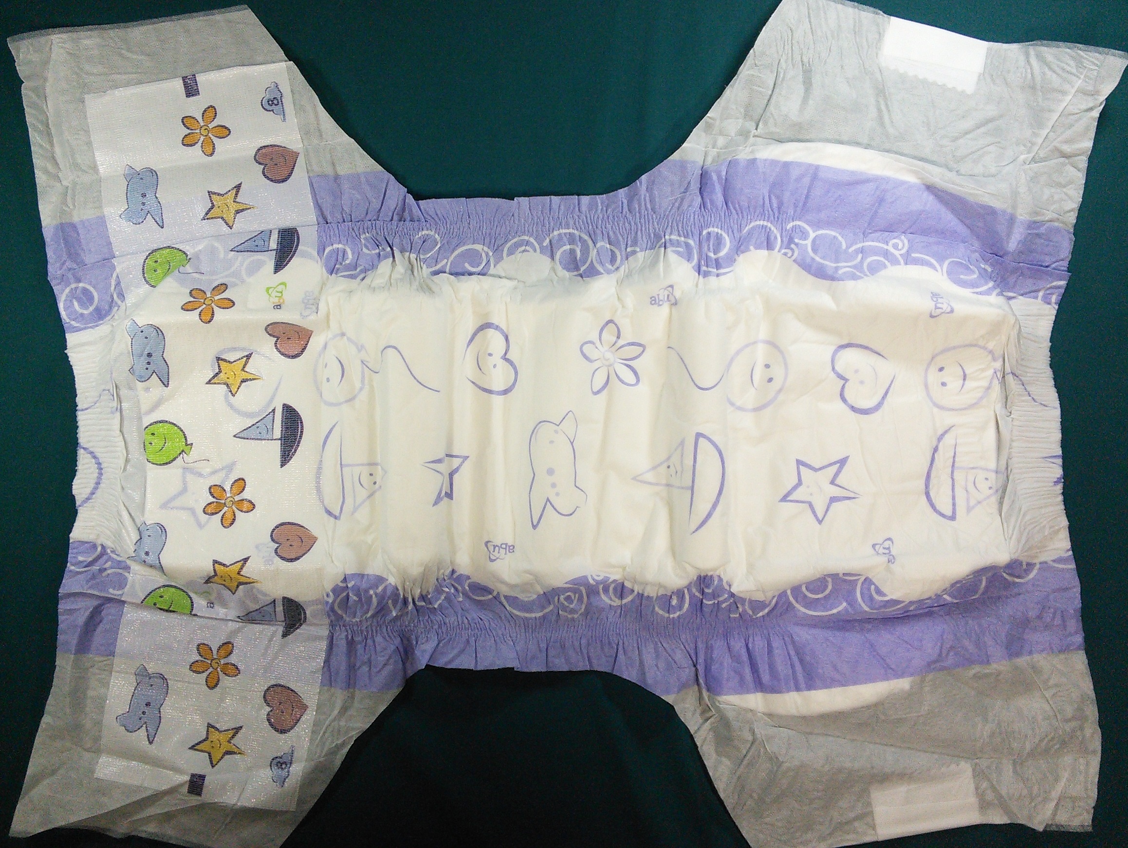 White cloth brief with purple-outlined sailboats, flowers, airplanes, stars, hearts, and balloons, with an “abu” logo. Landing zone has the same elements colored in. Purple leg gathers. Padding has circular bumps in a hex pattern.