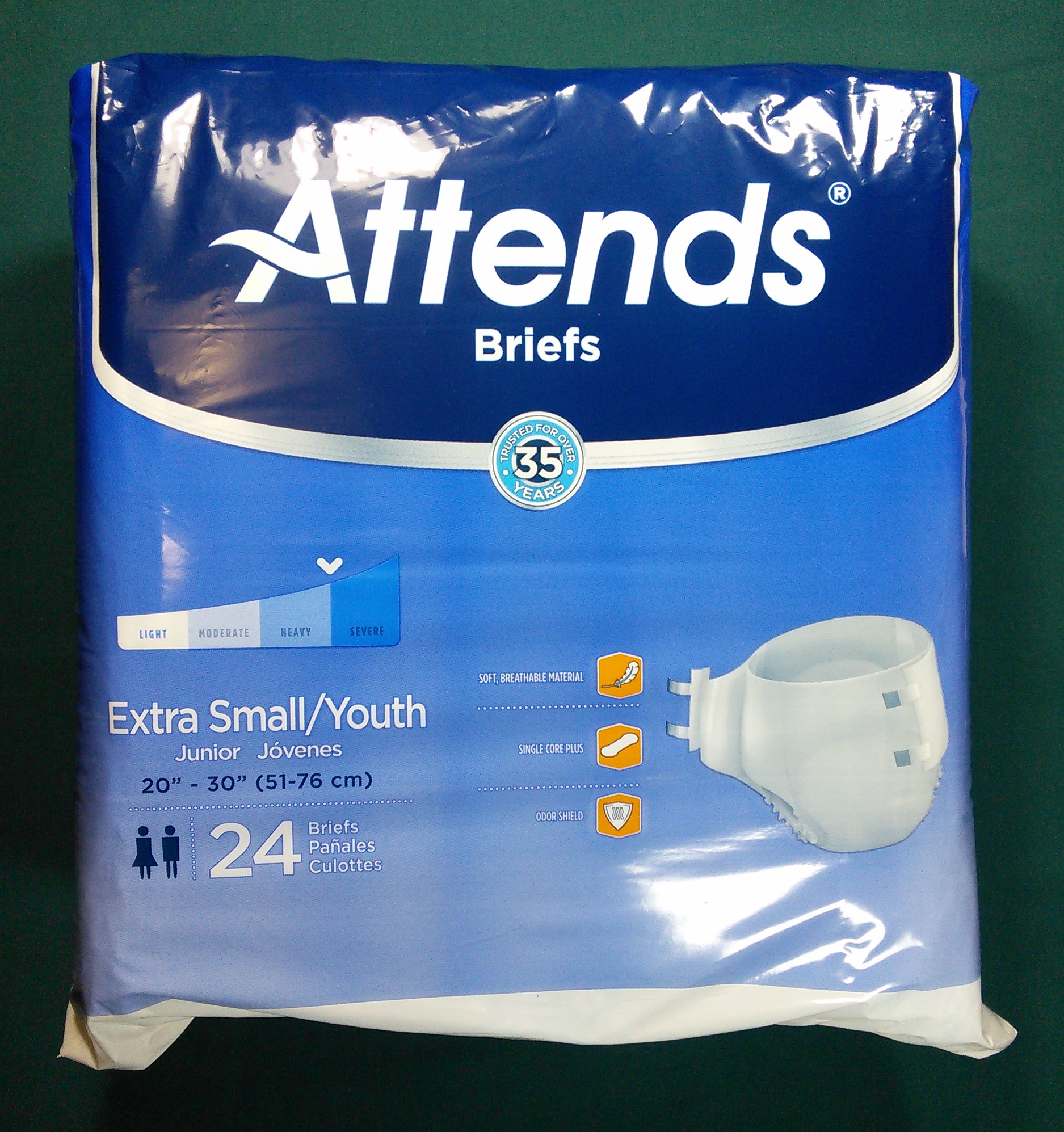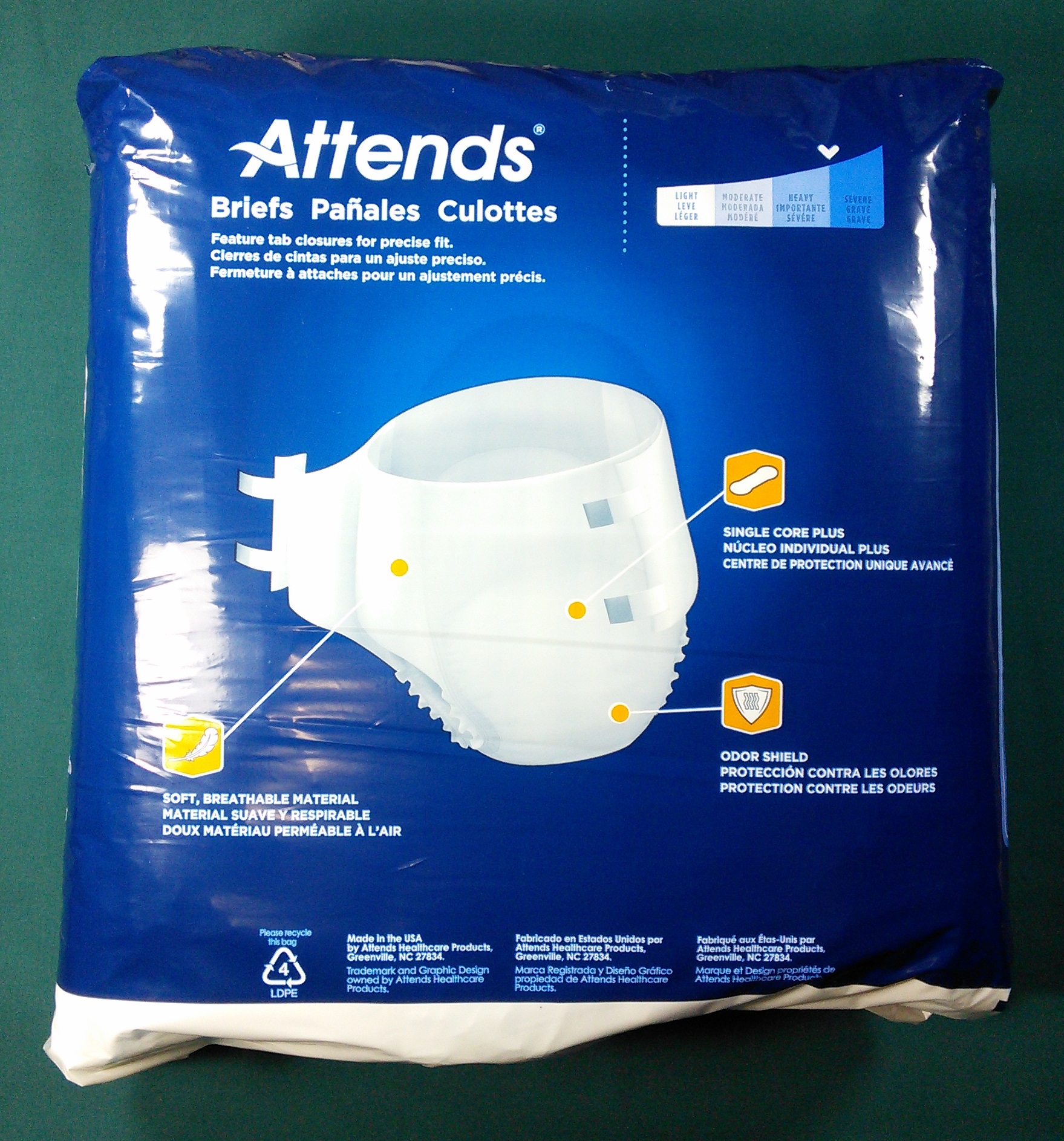Light blue cloth brief with two yellow wetness stripes; four tapes with “Attends” in blue; padding is plain white.
