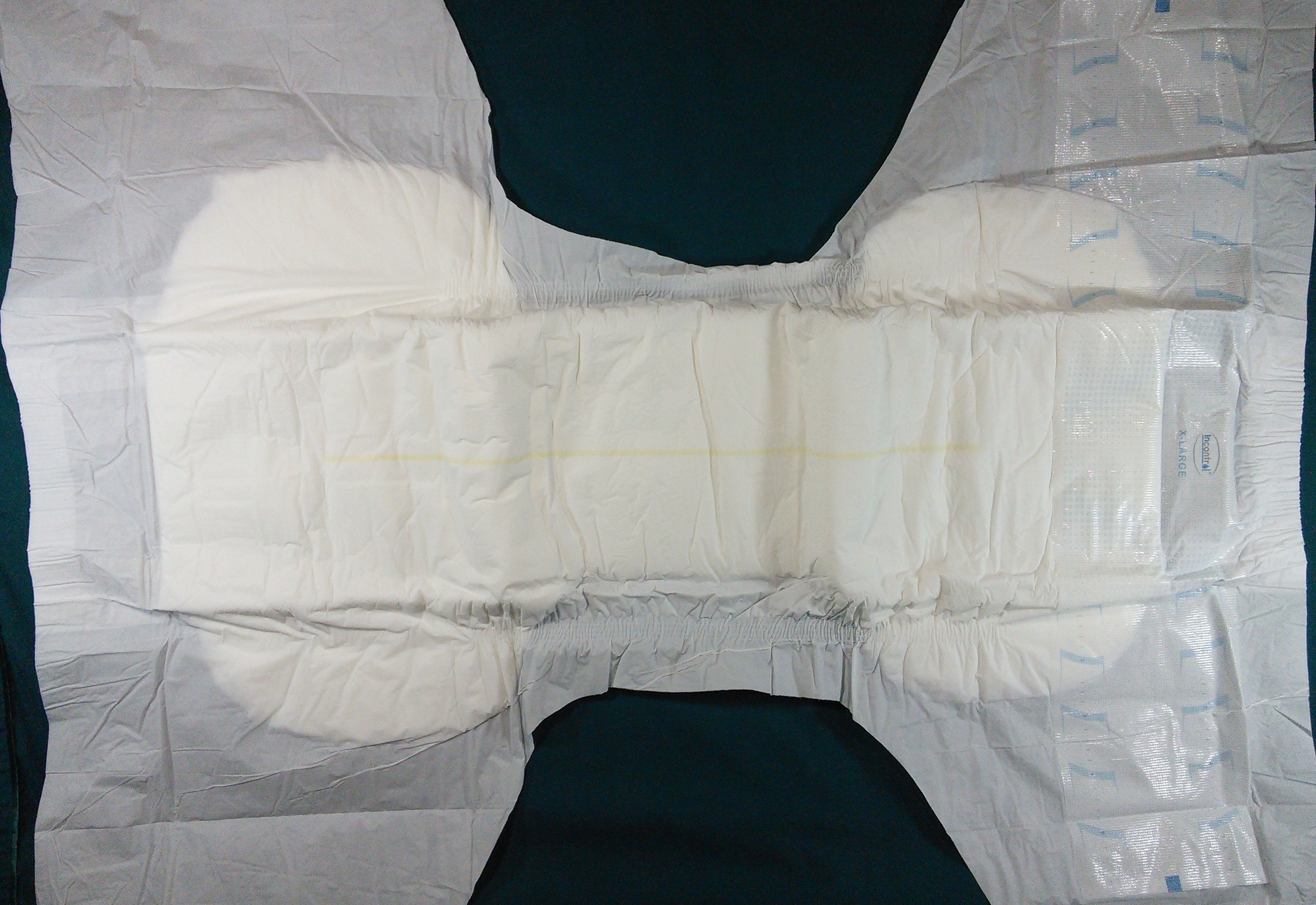 White plastic brief with “Incontrol” logo and the size in blue capital letters at the waist. Landing zone has light blue circles and square bracket shapes as well as tick marks and numbers to indicate different taping positions. Velcro tapes.