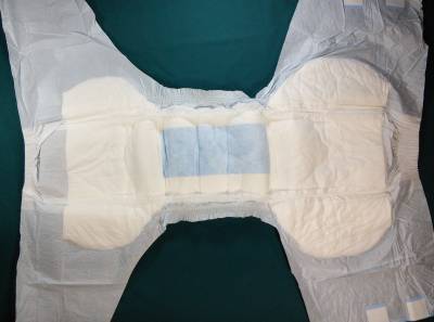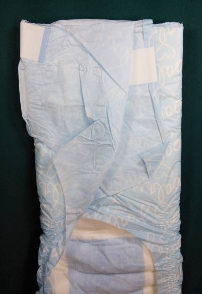 White plastic brief with teddy bears, baby bottles, pacifiers, diaper pins, rattles, baby bonnets, ducks, hearts, and buttons. Light blue wings with “baby” in white script.