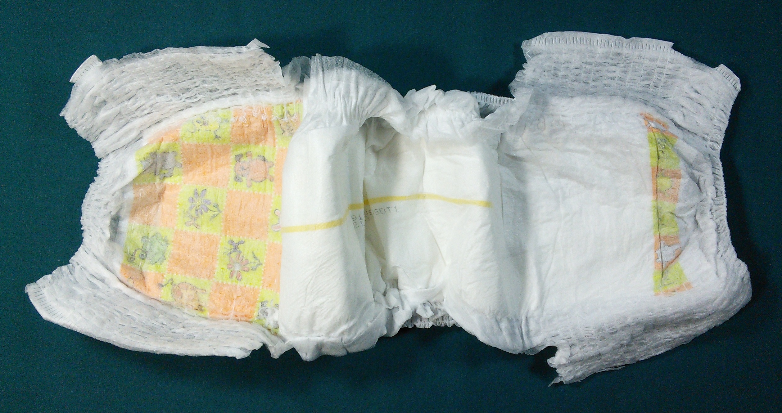White child pull-up, size 3t-4t. Front panel is a yellow and orange checkerboard pattern with dogs, cats, bunnies, giraffes, frogs, chicks, butterflies, and flowers. The top rear has a similar pattern but only 1 x 6 squares and the backs of the animals. Thick yellow stripe down the center of the pull-up from front to back. Near the stripe it says “SIZE 3”.
