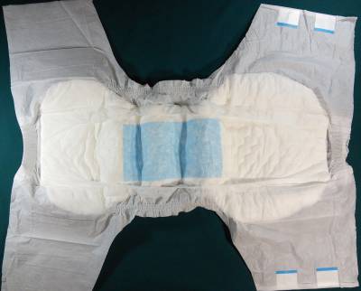White plastic brief, plain except for “abu” logos and the size letter, both of which are covered up when the diaper is taped on. The padding has circular bumps in a hex pattern.