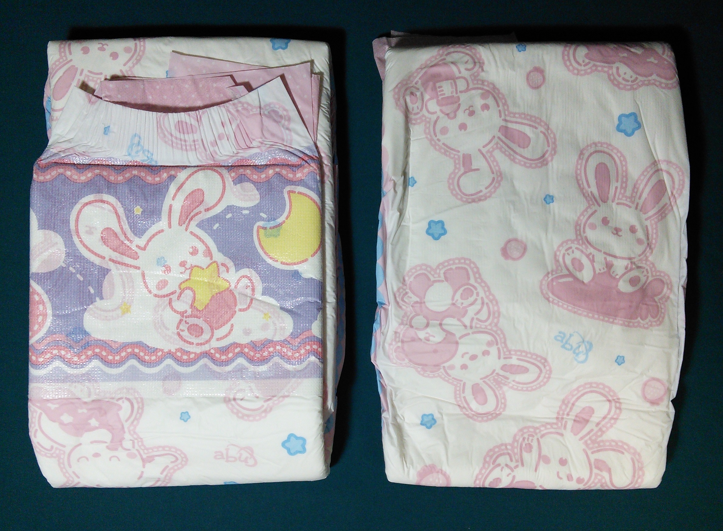 White plastic brief with two velcro tapes; pink bunnies and blue stars; rough blue or purple landing zone; pink and blue leg gathers; pink wings with white polka dots.