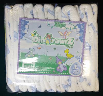White plastic brief with velcro tapes; large blue dinosaurs; rough blue and purple landing zone with pink dinosaur; blue stone pattern on leg gathers; blue wings.