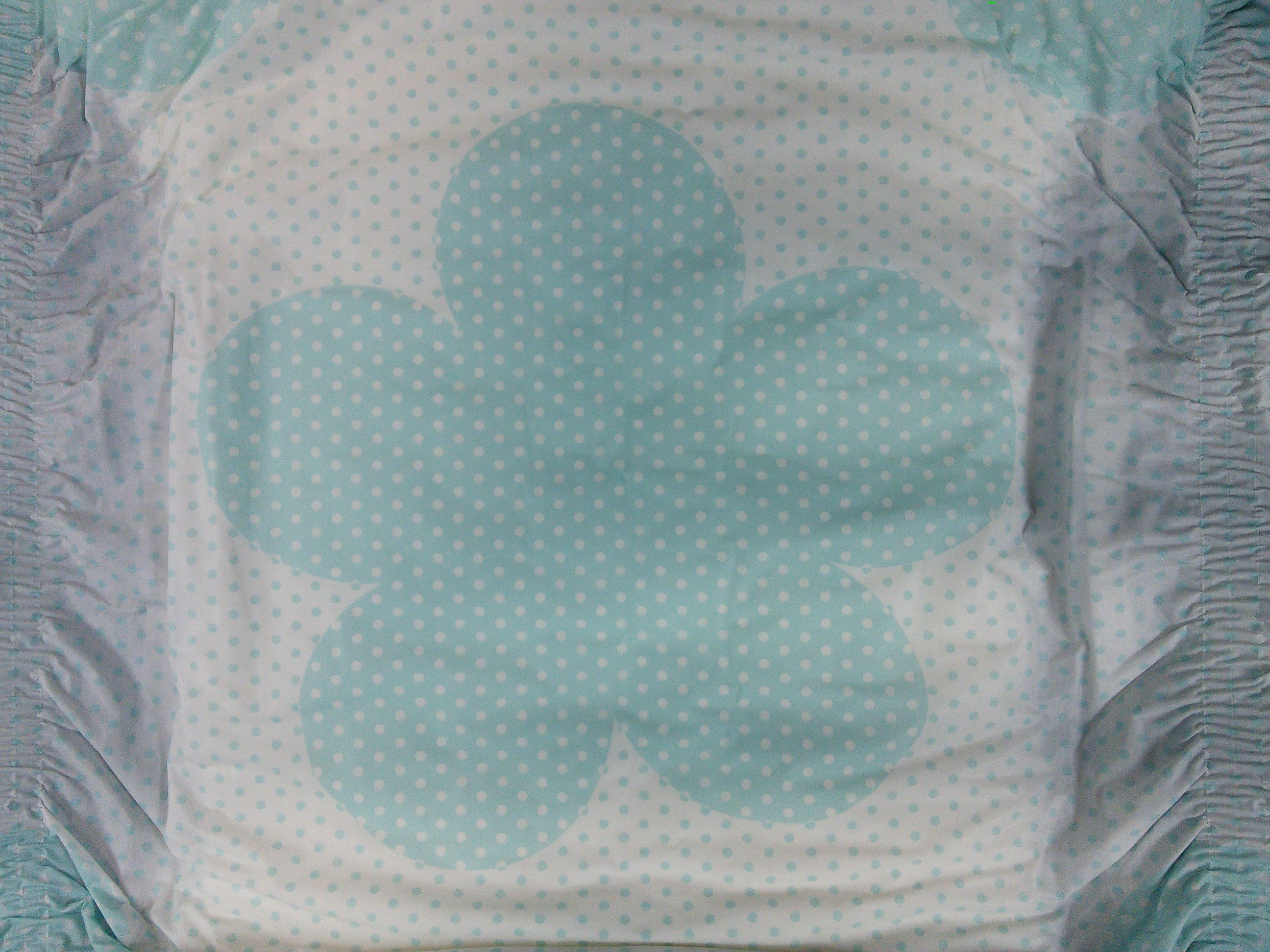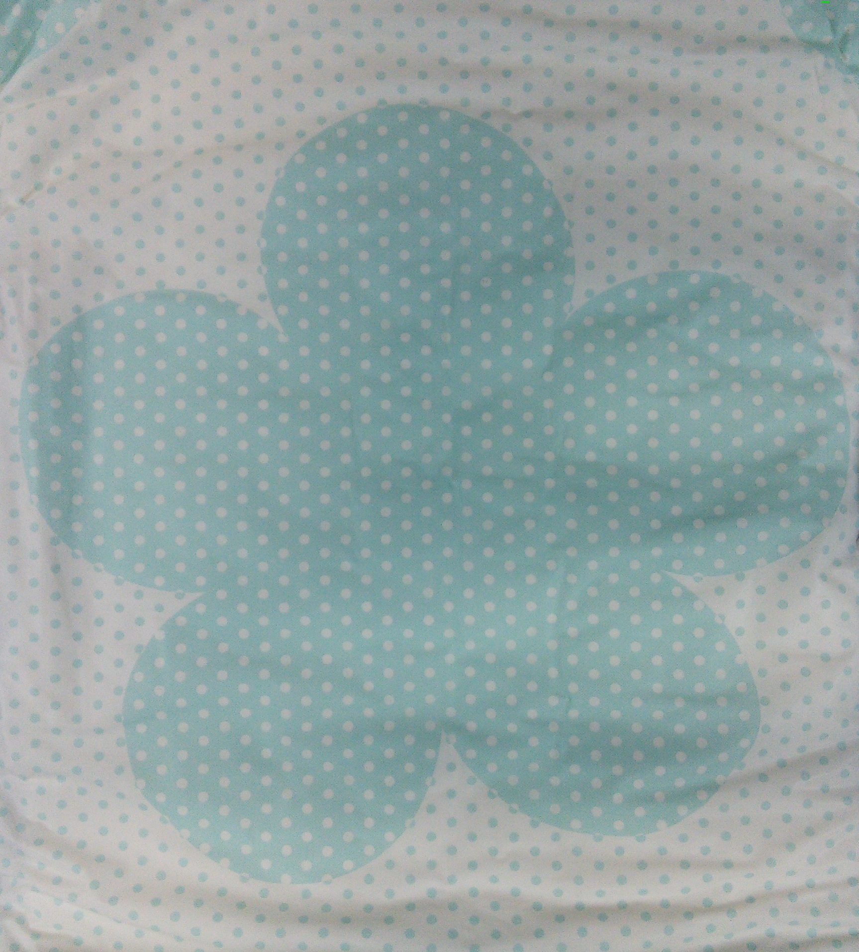 White plastic brief with tiny baby blue polka dots and large baby blue flowers with tiny white polka dots. The landing zone has blue and green owls and blue and green stars and moons. The padding has circular bumps in a hex pattern.