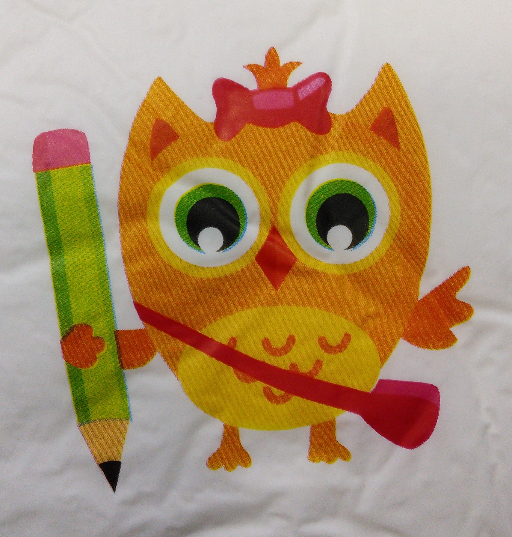 White plastic brief with “A B C”, “1 + 2 = 3”, books, backpacks, apples, crayons, and owls. Rough landing zone and velcro tapes.