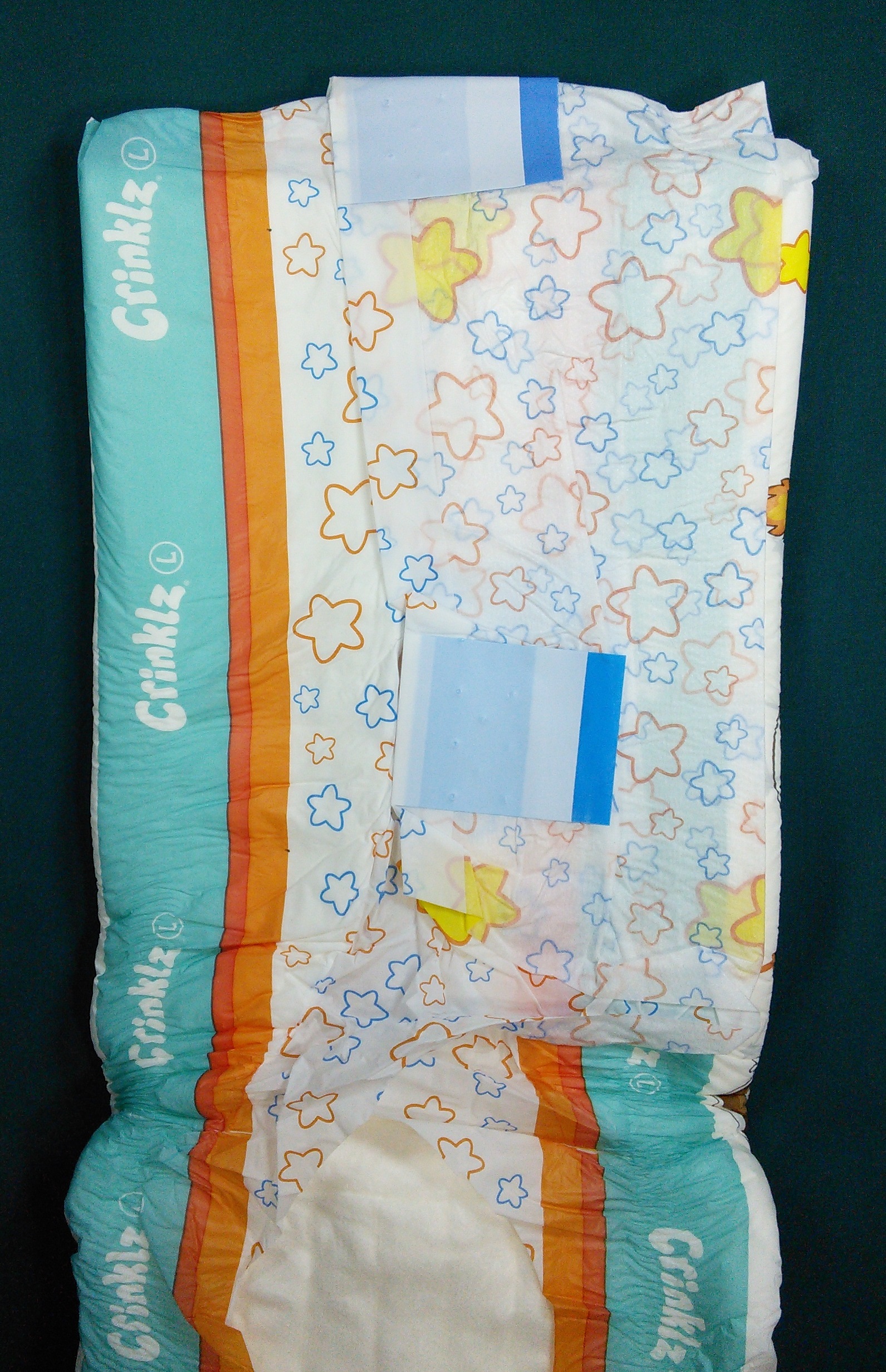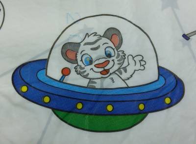 White plastic brief with monkeys and bears in space suits, a fox using a telescope, a white tiger in a flying saucer, a bear in a rocket ship, planets, stars, moons, and satellites. Broad cyan stripe along the gathers with “Crinklz” next to orange and red stripes. Five-pointed stars on the wings.