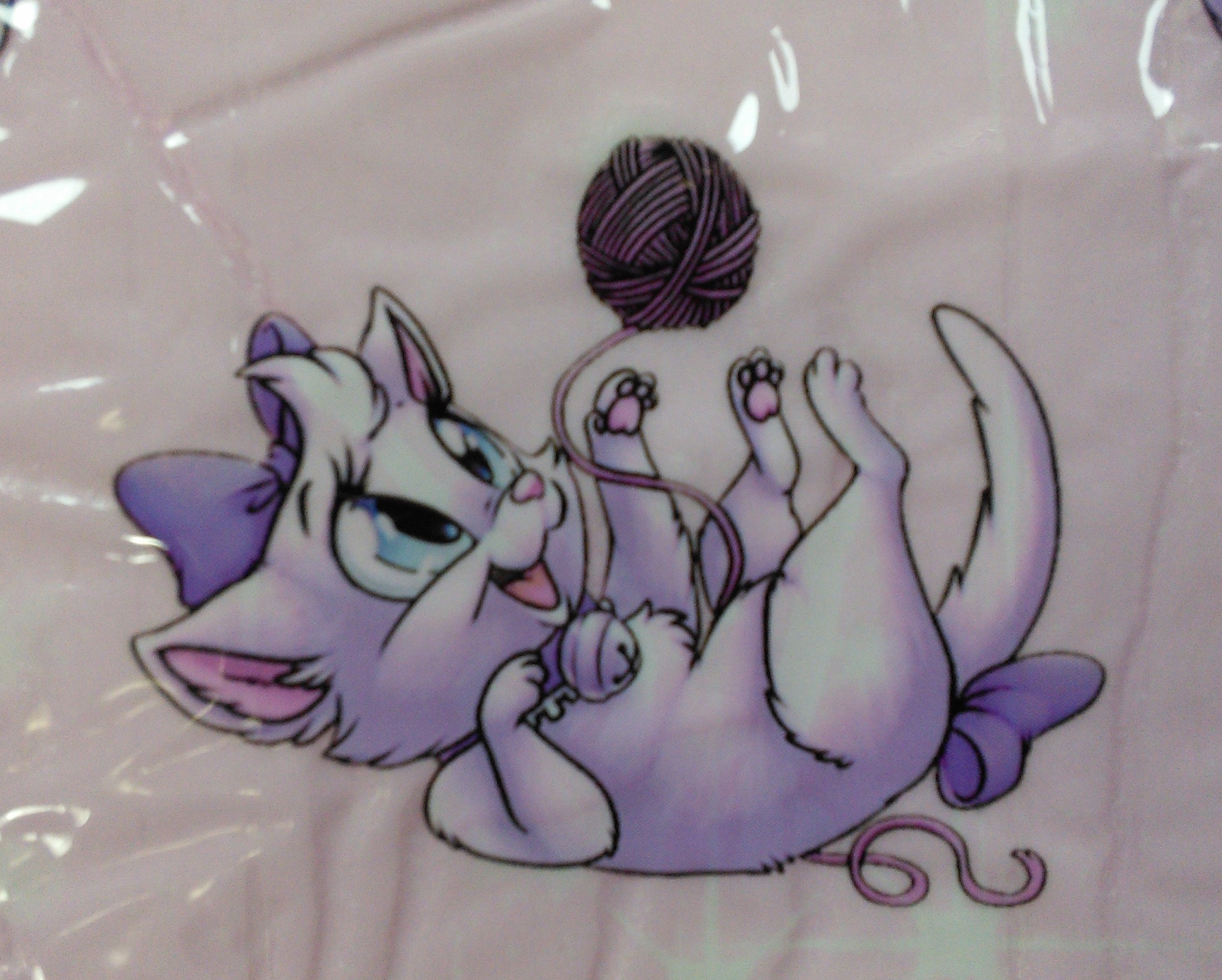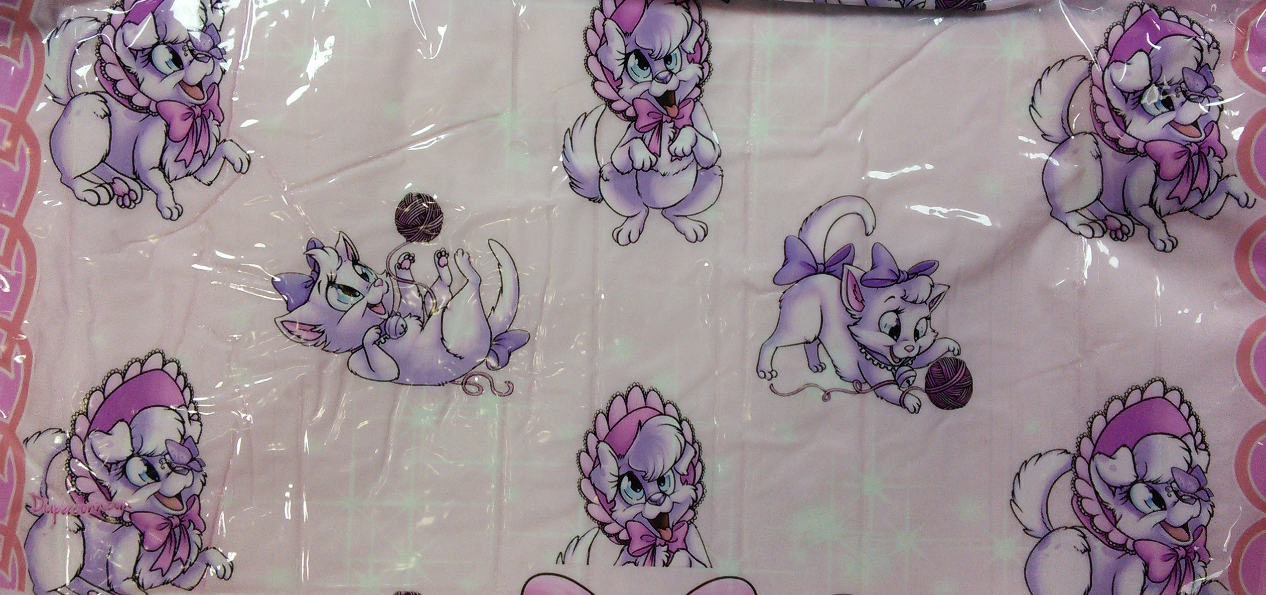 Light pink plastic brief with white stars and a dark pink swirly vine pattern running down the sides and through the leg gathers. The landing zone has puppies in baby bonnets and kittens playing with balls of twine, with left and right borders made of hearts and the sides of the landing zone filled with a pattern of tiny icons including hearts, rattles, diaper pins, and ducks.