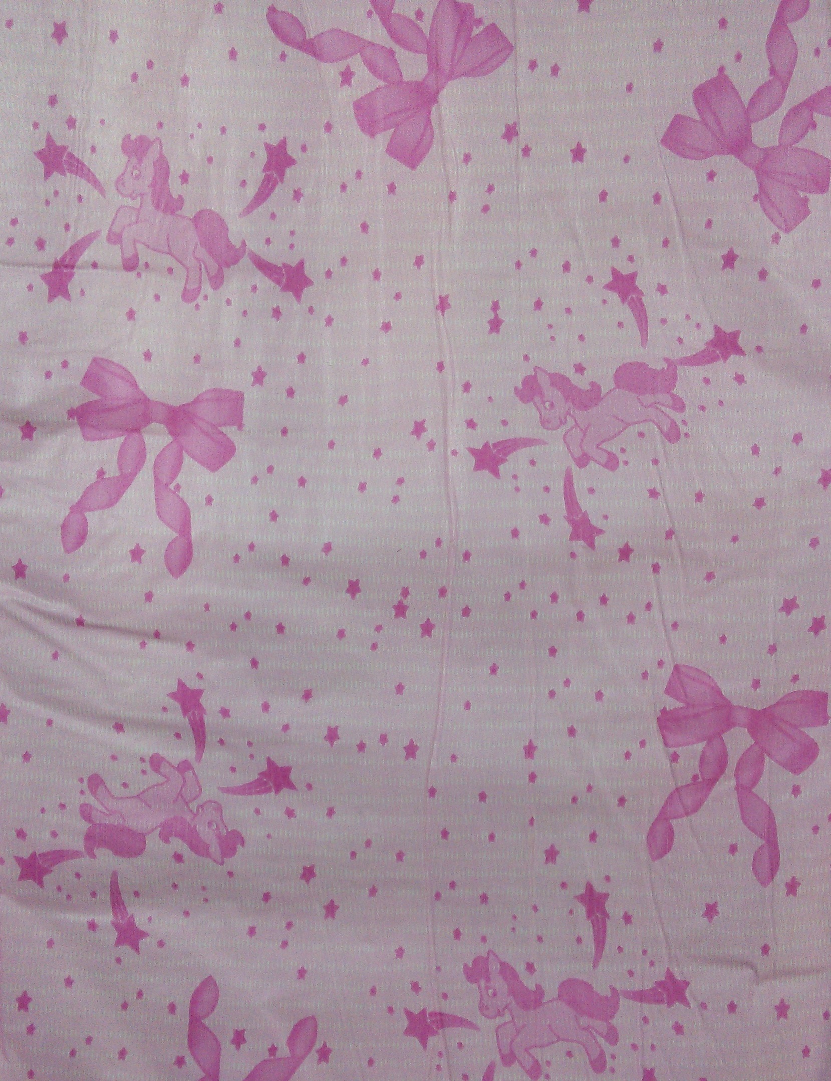 Pink plastic brief with dark pink ponies, ribbons, and stars. Wings and gathers are dark pink with white polka dots. The padding has circular bumps in a hex pattern.