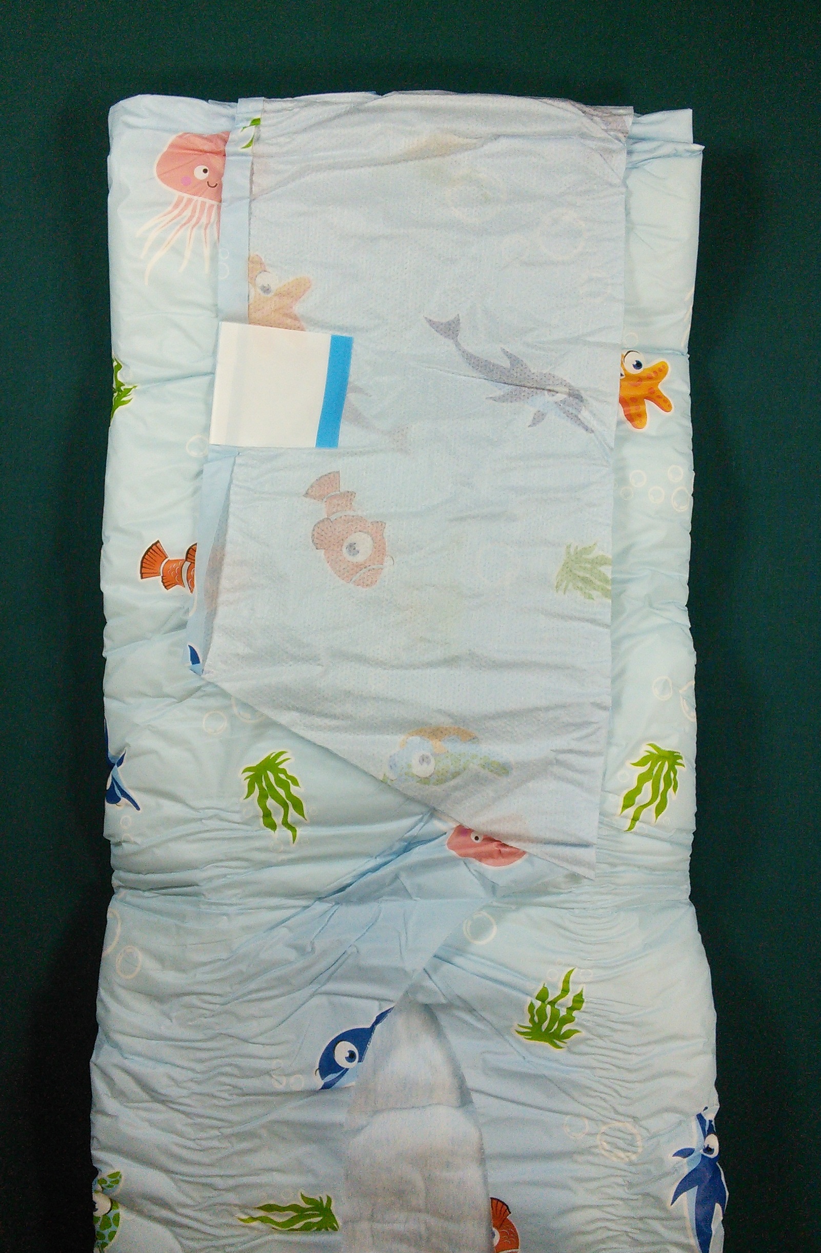 Light blue plastic brief with dolphins, seaweed, jellyfish, fish, starfish, and bubbles.