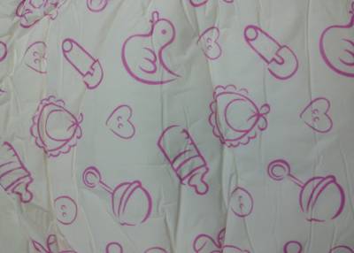 White plastic brief with pink-outlined teddy bears, ducks, hearts, baby bottles, diaper pins, pacifiers, and baby bonnets. Side panels and leg gathers are pink with white “baby” and hearts.