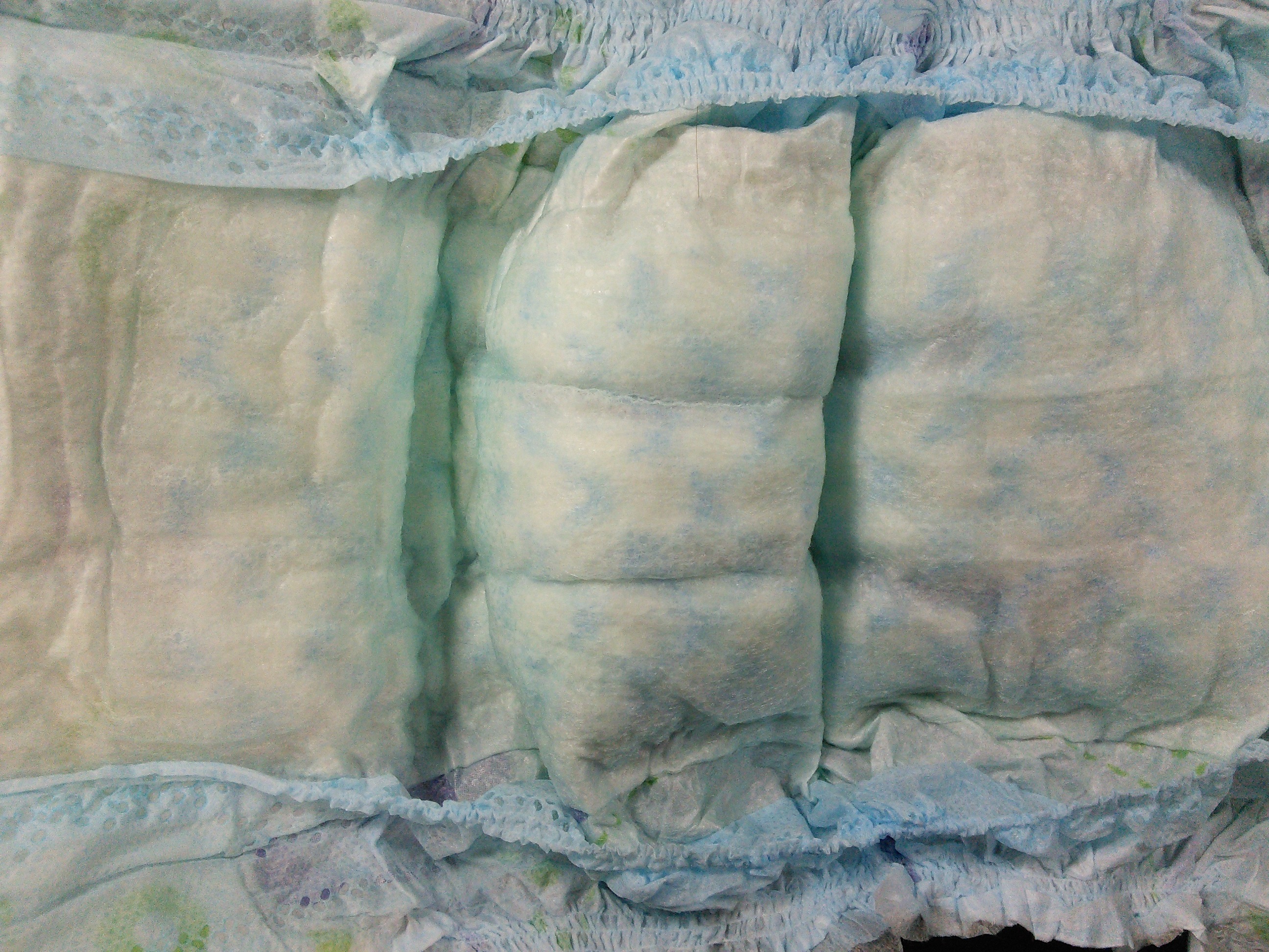 White baby diaper with purple “Luvs”. Light blue leg gathers and leak guards. White and light blou mottled padding.
