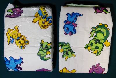White plastic brief with large yellow, green, blue, and purple horned monsters. Clear landing zone. Wings and gathers have a light green hexagon pattern.