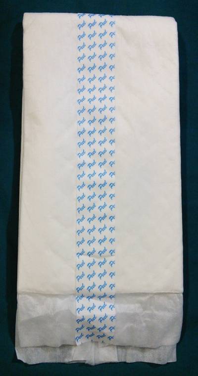 Quilted hourglass shape with a blue panel extending the full length. Wide tape covering the adhesive with blue “Peel”. Packaged with a duo-fold.