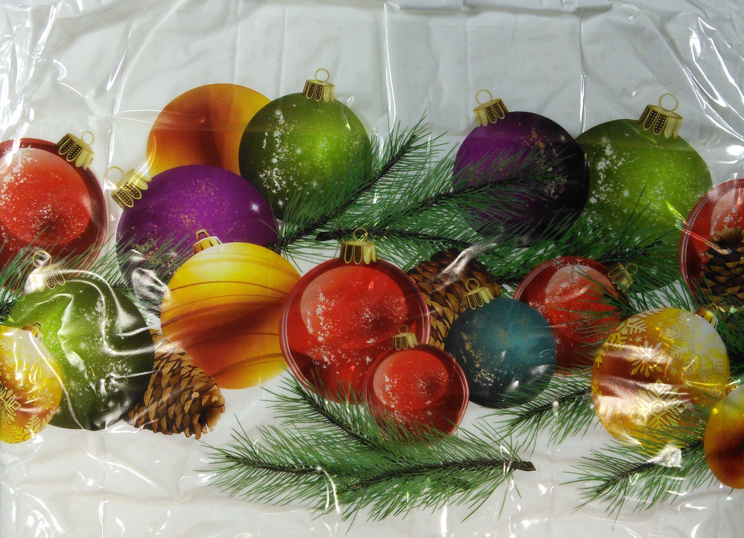 White plastic brief, plain except for the landing zone which has Christmas ornaments, pine cones, and evergreen branches.