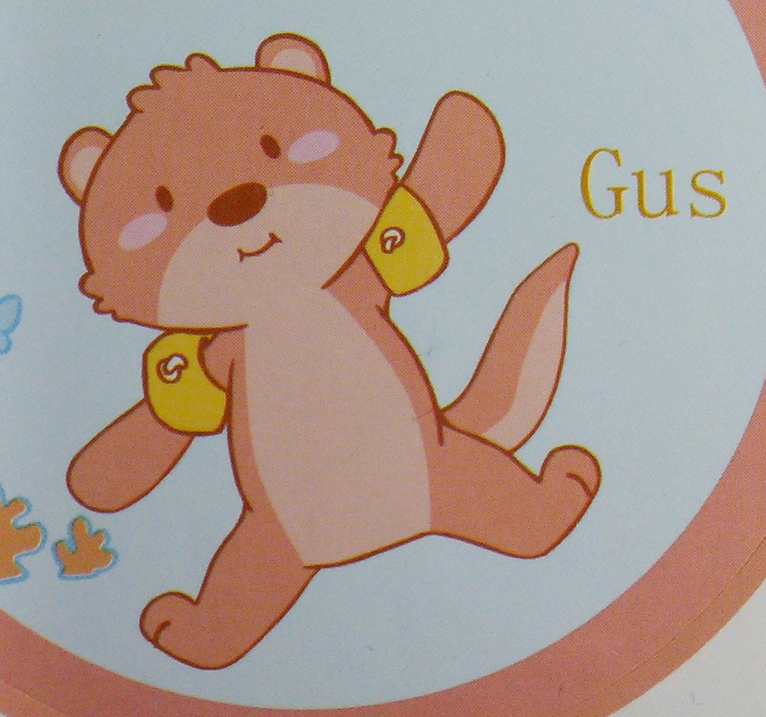 Light blue plastic brief with darker blue wings and leg gathers. Yellow bunnies, tigers, puppies, and bears. Pink otters with floaties. “REARZ” in blue.