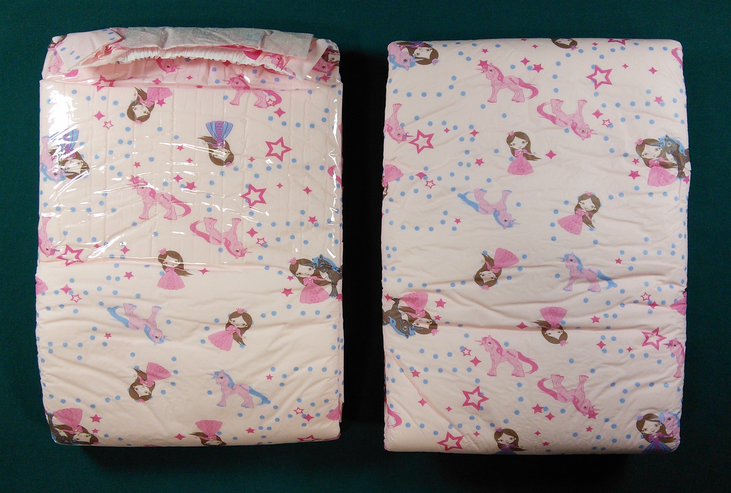Pink plastic brief with princesses and unicorns. Large dark pink panels on wings and leg gathers.