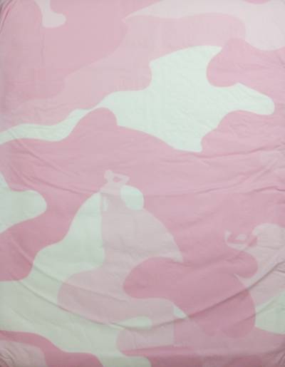 Pink plastic brief with camouflage pattern containing silhouettes of soldiers.