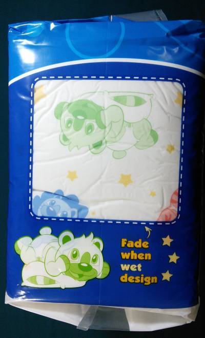 White plastic brief with lounging diapered lions and tigers, and yellow stars. Green, light blue, and pink wavy stripes running down the sides. Dark blue wings and leg gathers with light blue circles.
