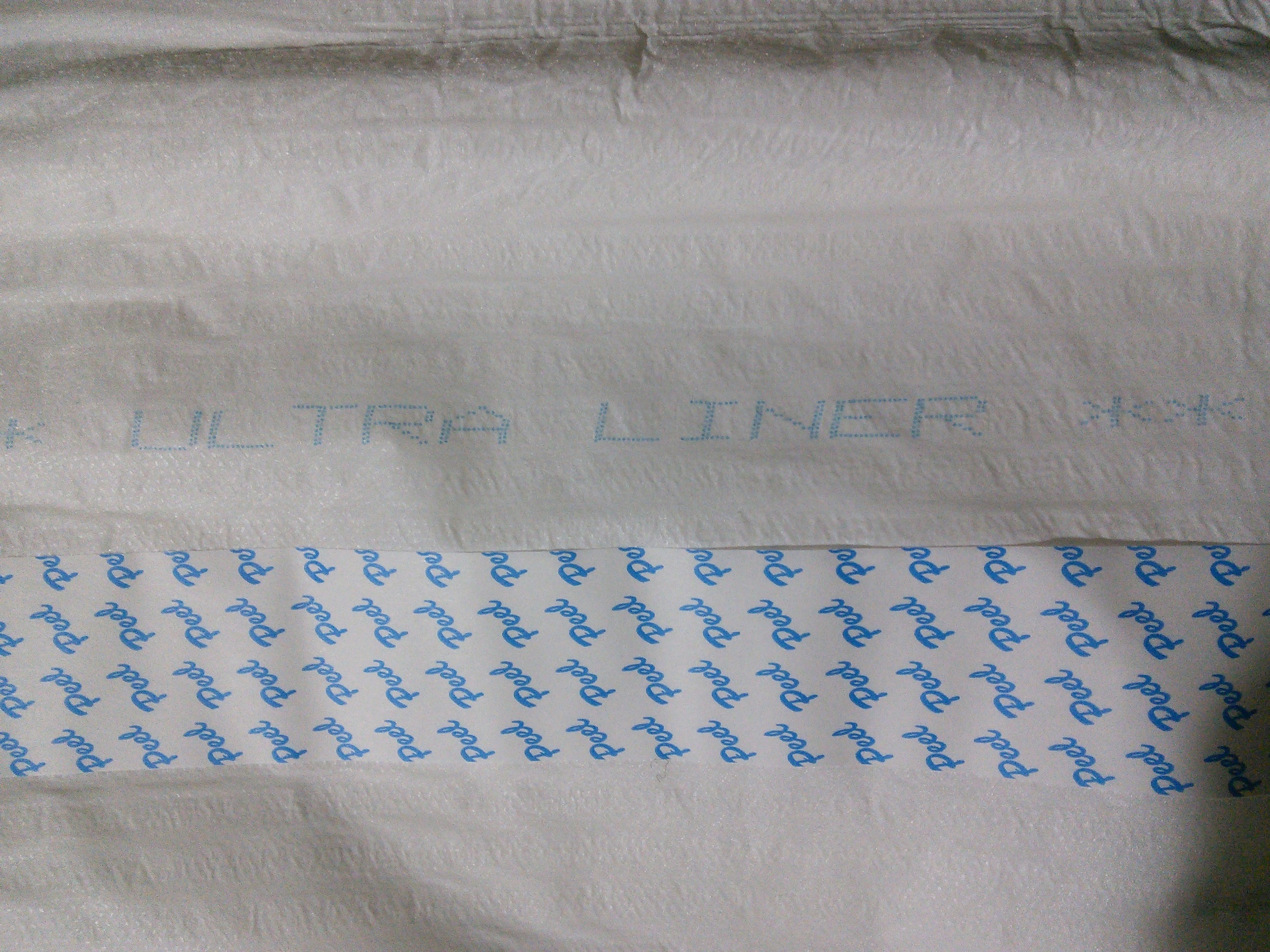 White plastic hourglass liner; wide tape covering the adhesive with blue “Peel”. “063 ULTRA LINER 0313”. Packaged with a tri-fold.