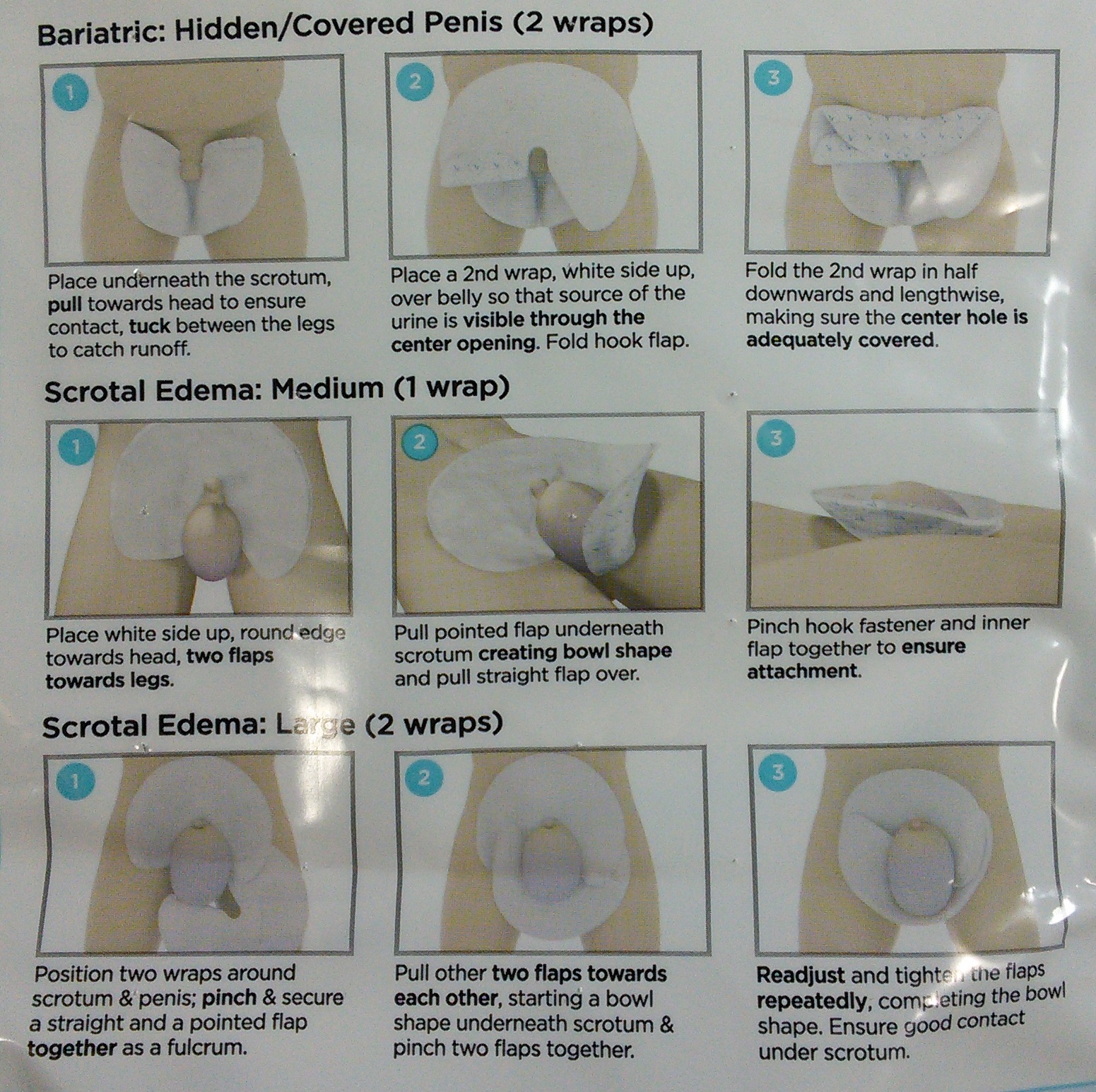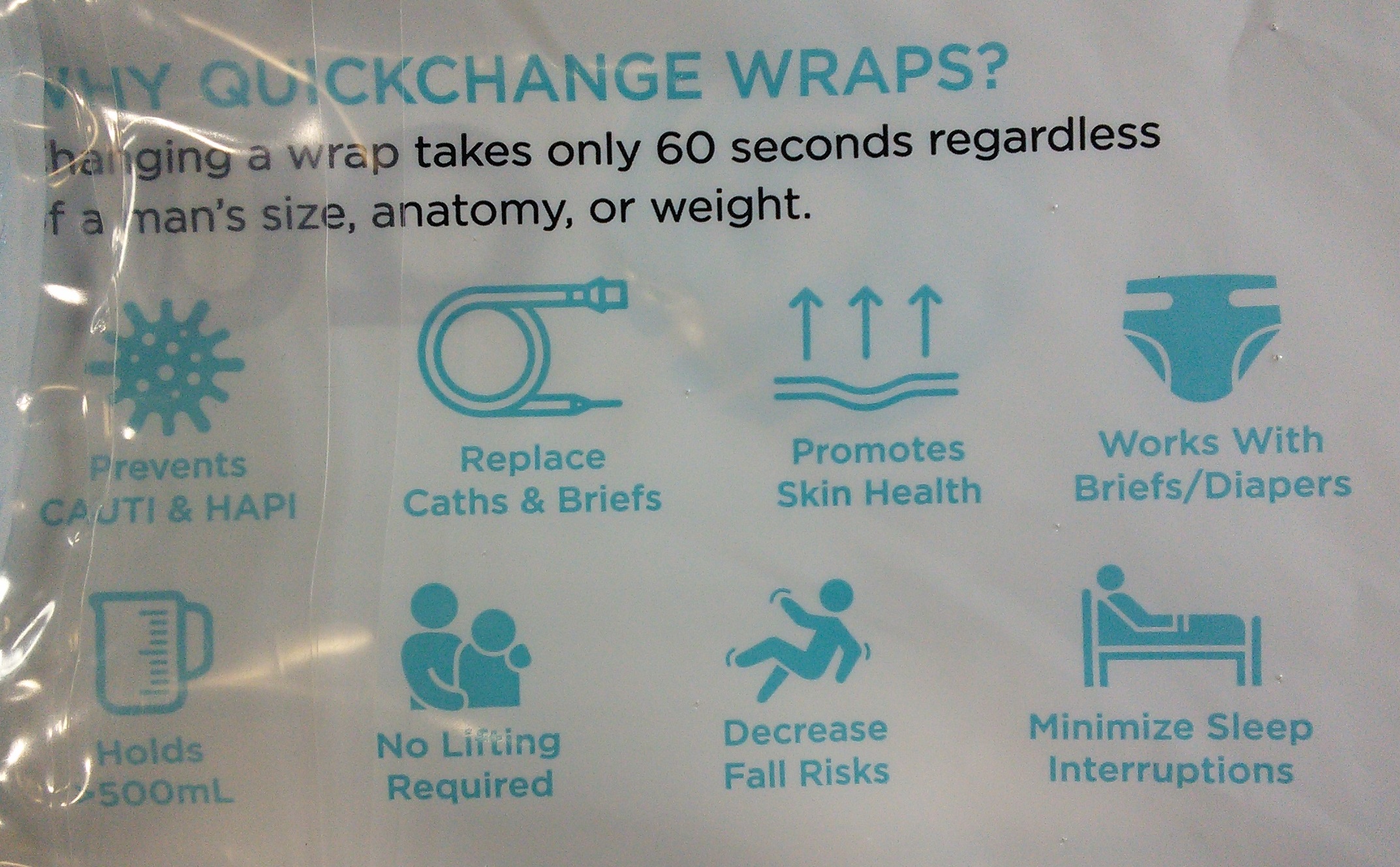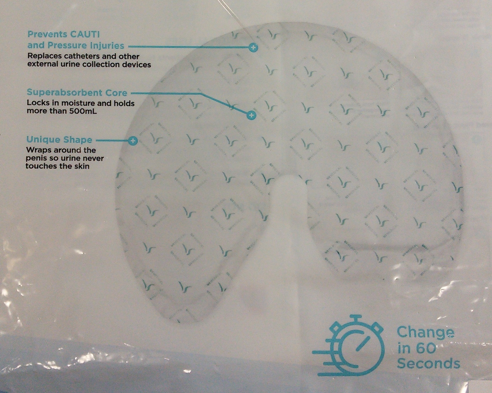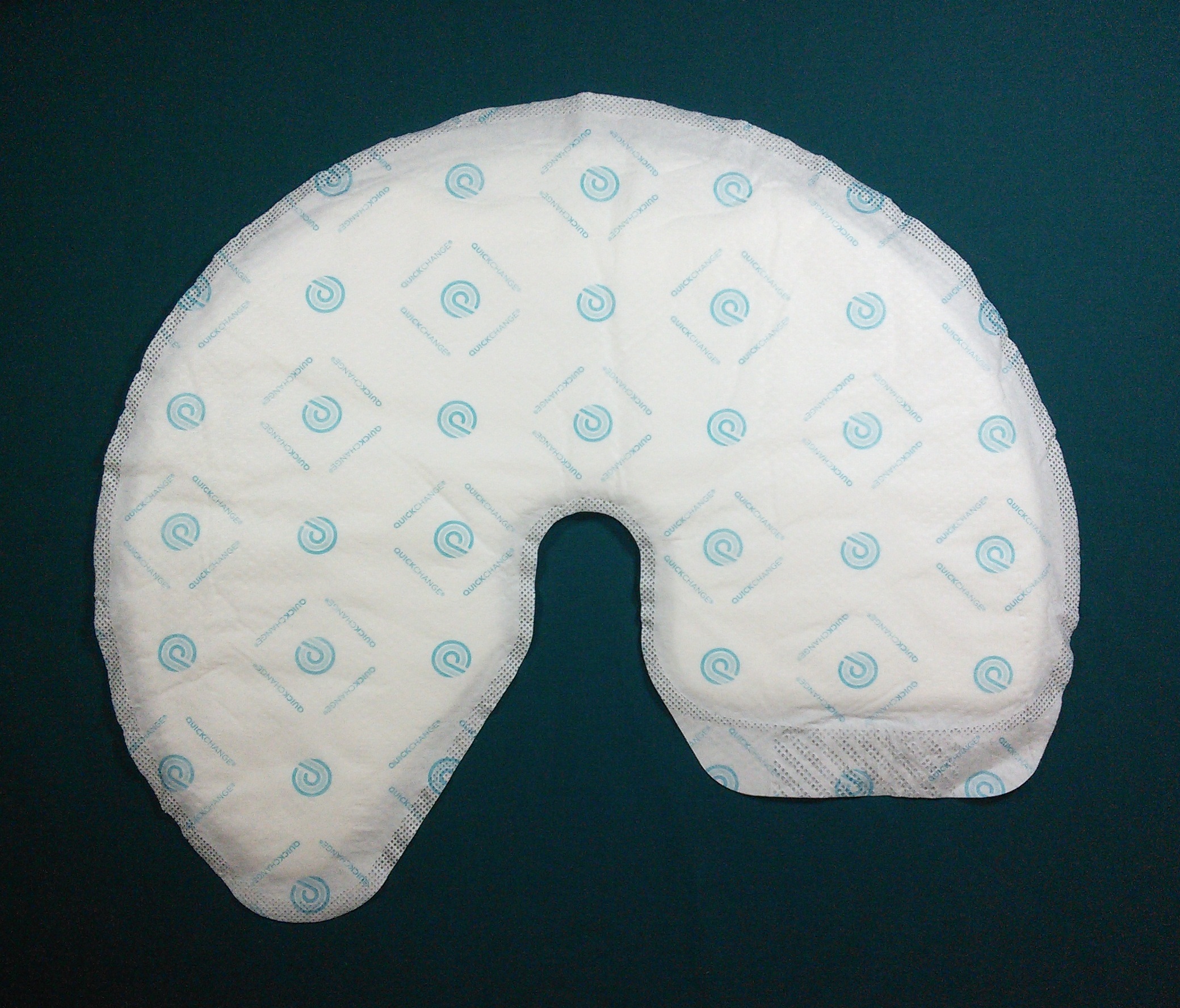 Thin, white U-shaped liner designed to be wrapped around a penis pointing up. Cloth backing with light blue circular logos and “QUICKCHANGE” in a diamond pattern. 1” velcro square for attaching the ends.