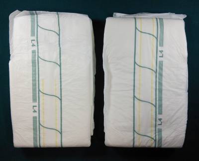 Pale green (at least for Large) cloth brief; two thin yellow wetness stripes, “Delta Form L3” or “Delta Form M3”.