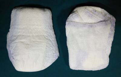 White pull-up with 3-4 thin purple stripes on the back of the waistband and a purple bow/flowers on the front; purple around the leg gathers.
