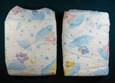 White plastic brief with blue, yellow, purple, and pink teddy bears floating on clouds, plus blue stars.