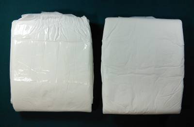 White plastic brief with landing zone, blue wings and edges. 3 in. tapes with blue ends.